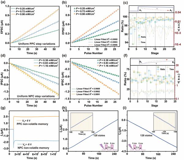 高線性權(quán)重更新:電導(dǎo)-脈沖數(shù)線性度R2>0.99,優(yōu)于現(xiàn)有二維/有機(jī)/氧化物體系。128態(tài)非易失存儲(chǔ):連續(xù)光脈沖下可分辨128級(jí)權(quán)重,對(duì)應(yīng)7 bit精度,保持時(shí)間>1000 s。