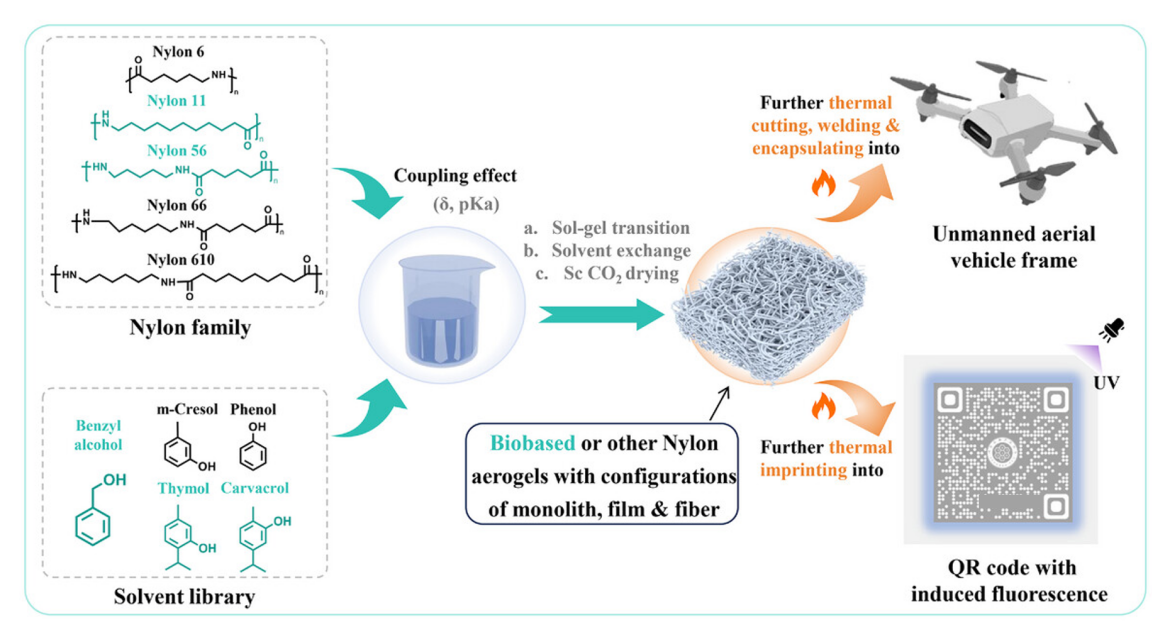示意圖:基于溶解度參數(shù)-pKa耦合效應(yīng)構(gòu)建的納米多孔尼龍氣凝膠家族示意圖,展示其熱塑性變形能力及伴隨的熒光現(xiàn)象。