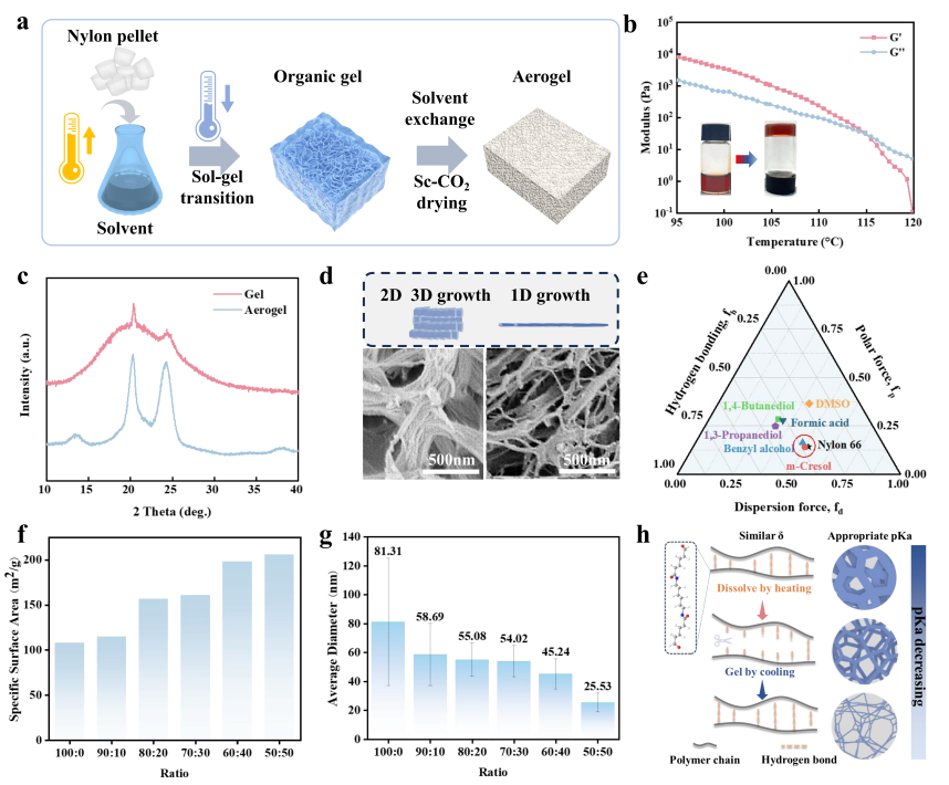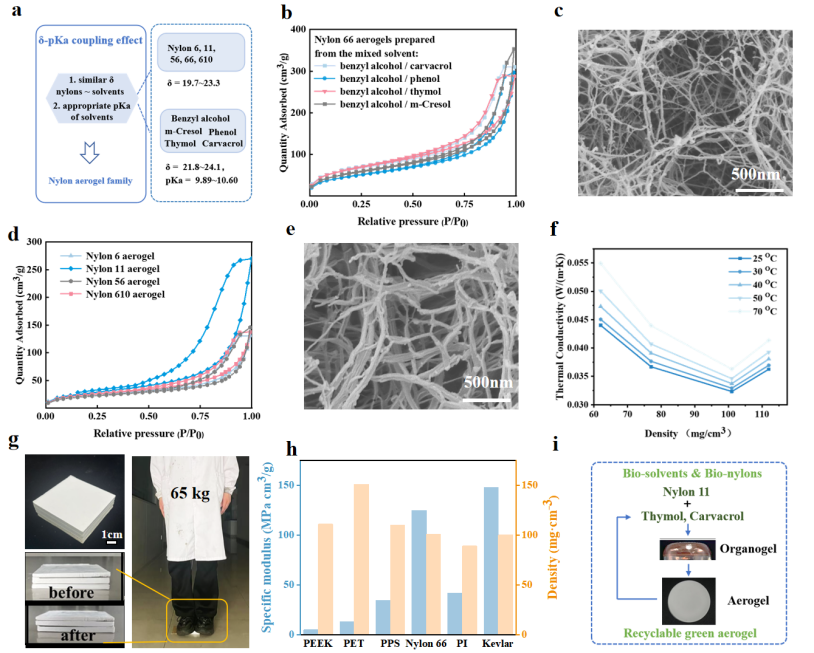 研究團(tuán)隊(duì)通過(guò)協(xié)同調(diào)控溶劑溶解度參數(shù)(δ)與酸解離常數(shù)(pKa),實(shí)現(xiàn)了對(duì)尼龍高分子在溶液中的結(jié)晶行為與自組裝路徑的精確控制(圖1)。在合適的δ-pKa組合下,尼龍分子可沿一維方向自組裝形成交織的納米纖維骨架,從而構(gòu)建出具有高比表面積(最高達(dá)226 m2·g?1)、優(yōu)異壓縮模量(12.6 MPa)和超低導(dǎo)熱系數(shù)(0.034 W·m?1·K?1)的納米多孔尼龍氣凝膠。