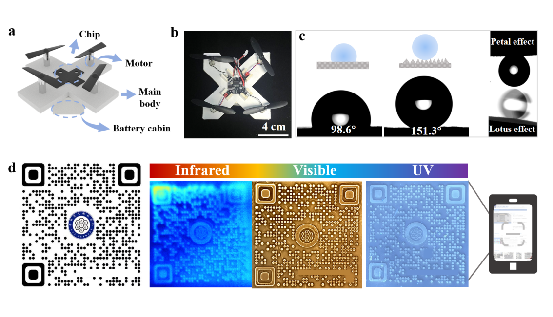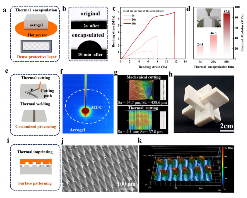 研究團(tuán)隊(duì)展示了多種熱機(jī)械加工技術(shù)(圖3,4):熱封裝:通過(guò)在氣凝膠表面形成致密尼龍保護(hù)層,顯著提升其機(jī)械強(qiáng)度與阻隔性;熱切割與熱焊接:可實(shí)現(xiàn)氣凝膠的精準(zhǔn)形狀的定制化編輯與復(fù)雜結(jié)構(gòu)(如無(wú)人機(jī)機(jī)身、魯班鎖)的裝配;熱壓印:可在氣凝膠表面構(gòu)建微結(jié)構(gòu),實(shí)現(xiàn)超疏水(荷葉效應(yīng)、花瓣效應(yīng))與熒光圖案,應(yīng)用于信息加密與防偽。