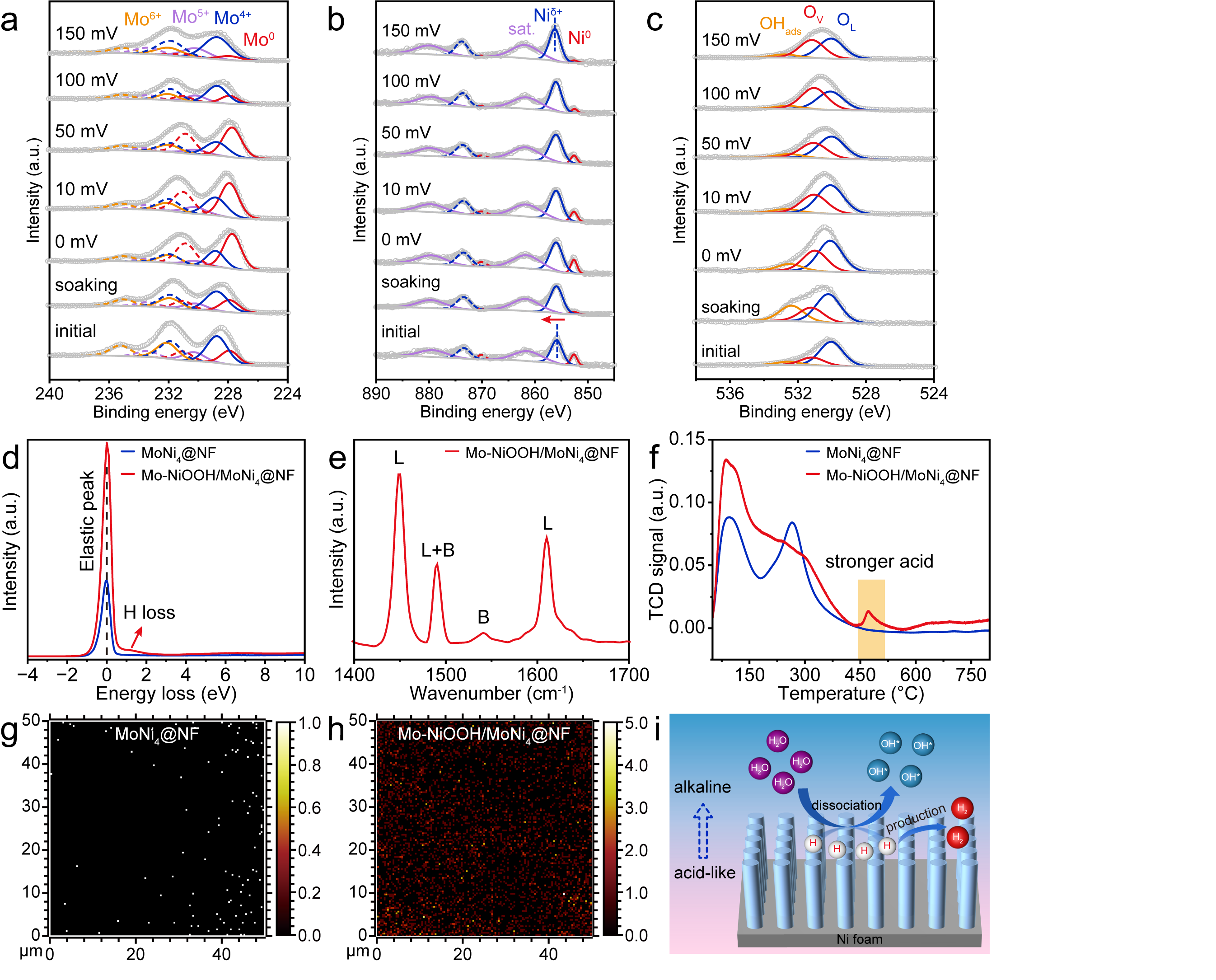 圖1. MoNi4@NF催化劑準原位變電位條件下的(a)Mo 3d,(b)Ni 2p和(c)O 1s XPS譜圖。Mo-NiOOH/MoNi4@NF催化劑表面化學特性表征:(d)REELS譜圖,(e)Py-IR譜圖,(f)NH3-TPD曲線,(g和h)催化劑表層H3O+的二維成像圖。(i)構建局部類酸催化界面的示意圖。