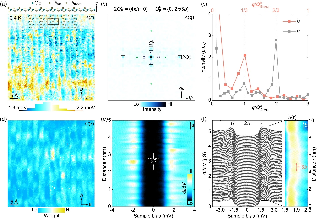 在前期欠摻雜單層1T′-MoTe2中觀察到共存五倍單軸電荷密度波與配對(duì)密度波的基礎(chǔ)上(Phys. Rev. B 112,L060503 (2025)),中國(guó)科學(xué)院蘇州納米所納米真空互聯(lián)實(shí)驗(yàn)站李坊森研究員等與清華大學(xué)物理系宋燦立、馬旭村、薛其坤研究團(tuán)隊(duì)及波士頓學(xué)院汪自強(qiáng)研究組合作,基于真空互聯(lián)的極低溫掃描隧道顯微鏡和分子束外延等設(shè)備,在單層1T′-MoTe2超導(dǎo)薄膜首次直接觀測(cè)到亞晶格內(nèi)庫(kù)珀對(duì)密度波(PDW)與電荷密度波(CDW)的競(jìng)爭(zhēng)-耦合共存現(xiàn)象。研究團(tuán)隊(duì)在高質(zhì)量原位外延生長(zhǎng)單層1T′-MoTe2薄膜的基礎(chǔ)上,利用極低溫掃描隧道顯微鏡/隧道譜成像,清晰地觀察到超導(dǎo)能隙大小、相干峰強(qiáng)度及能隙內(nèi)態(tài)密度的周期性空間調(diào)制(如下圖所示)。