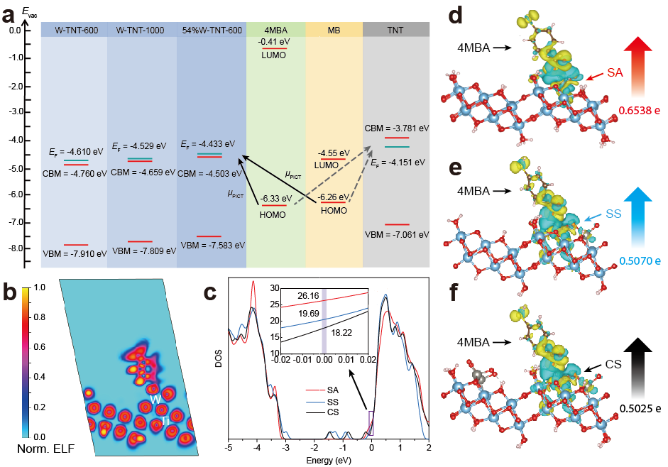 圖2. 單原子基底上 SERS 增強的機理研究。(a) TNT、W-TNT-600、W-TNT-1000和54%W-TNT-600相對于MB和4MBA探針分子的能級圖;(b) 4MBA-SA系統(tǒng)的ELF圖;(c) SA、SS和CS的態(tài)密度。4MBA在 (d) SA、(e)SS和(f) CS上的差分電荷和電荷轉(zhuǎn)移量,其中藍色區(qū)域表示電荷損失,黃色區(qū)域表示電荷聚集。