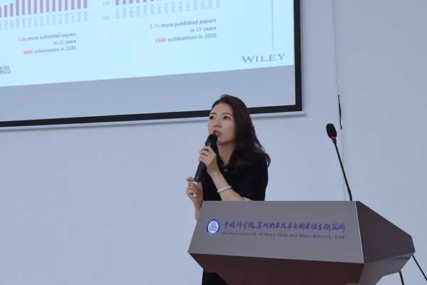 7月20日,Wiley出版社的期刊主編姜玥玥博士和副主編施璐博士來(lái)蘇州納米所交流,并作題為“Wiley材料學(xué)期刊論文發(fā)表”的講座。所內(nèi)相關(guān)領(lǐng)域的老師及同學(xué)參加了此次講座。