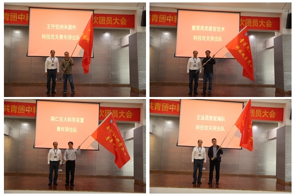 隨后,黨委書記鄧強分別為“王守覺納米器件科技攻關青年突擊隊”“王淦昌智能編隊科技攻關突擊隊”“童第周類器官技術科技攻關突擊隊”和“南仁東大科學裝置青年突擊隊”授旗。突擊隊隊員面向隊旗莊嚴宣誓,對標老科學家精神,發(fā)出錚錚誓言:我志愿加入突擊隊,心系國家事、肩扛國家責,積極投身“急難險重”任務,召之即來,來之能戰(zhàn),團結(jié)協(xié)作,拼搏奉獻,銳意創(chuàng)新,勇當先鋒,為實現(xiàn)高水平科技自立自強貢獻力量!