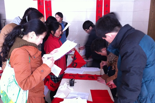2月4日午時(shí),在我所C座一樓大廳內(nèi),主辦人員還未擺設(shè)好臺架和紙張筆墨,就已有師生前往等候。此后,聞?dòng)嵹s來的師生絡(luò)繹不絕,他們迫不及待的從主辦方提供的春聯(lián)目錄中挑出自己心儀的春聯(lián)佳句。李濤濤和宋民順兩位書法高手對師生有求必應(yīng),把紅紙鋪滿桌面,飽蘸墨汁,大筆一揮,龍飛鳳舞,用心地寫下一幅幅春聯(lián)和福字。“宏圖大展前途遠(yuǎn),吉星高照事業(yè)興”、“五湖四海皆春色,萬水千山盡光輝”等春聯(lián)既抒發(fā)了辭舊迎新的喜悅,又飽含著對我所師生的新春祝福。師生們從書法高手手中接過春聯(lián),如獲至寶,喜悅之情溢于言表,并紛紛在簽名表上用毛筆一試身手。在兩個(gè)多小時(shí)的時(shí)間里,我們的兩位書法高手忙碌得幾乎不得片刻休息,熱情高漲。一幅幅寓意美好、蒼勁有力、散發(fā)濃濃墨香而又寓意深刻的春聯(lián),映紅了我所師生的臉龐,現(xiàn)場充滿著歡聲笑語和濃濃暖意。