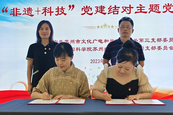 在王英和鄭長浩的見證下,結(jié)對雙方書記簽署了共建協(xié)議。王英和鄭長浩分別講話,他們都對本次黨建結(jié)對表示祝賀,希望兩個支部能陸續(xù)開展以“非遺、科技”為主題的系列活動,將非遺的保護傳承和科技的創(chuàng)新發(fā)展結(jié)合起來,讓更多先進科技力量匯聚到非遺傳承與保護領(lǐng)域中來。
