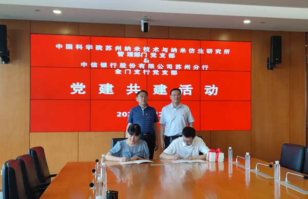 6月20日,蘇州納米所管理部門黨支部與中信銀行蘇州分行金門支行黨支部在中信銀行蘇州分行大樓舉行黨建共建簽約儀式。所紀(jì)委書記袁艷明、中信銀行蘇州分行黨委委員陳哲、黨委辦公室主任王英、管理部門黨支部書記王瑗等參加活動(dòng)。