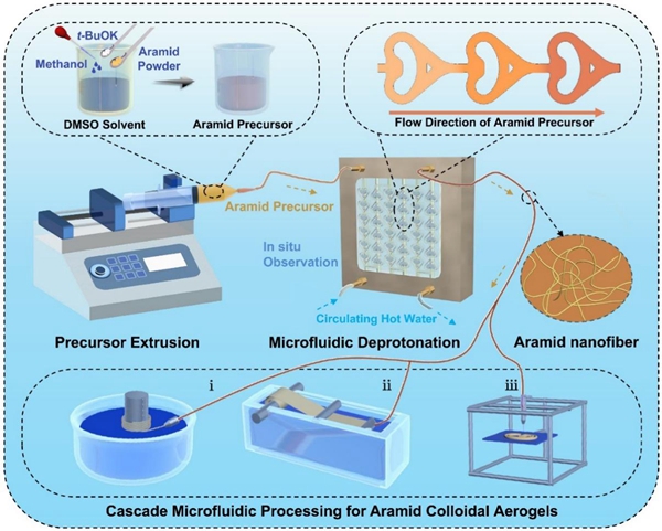 圖1. 芳綸納米纖維及其級聯(lián)微流控策略制備膠體氣凝膠示意圖