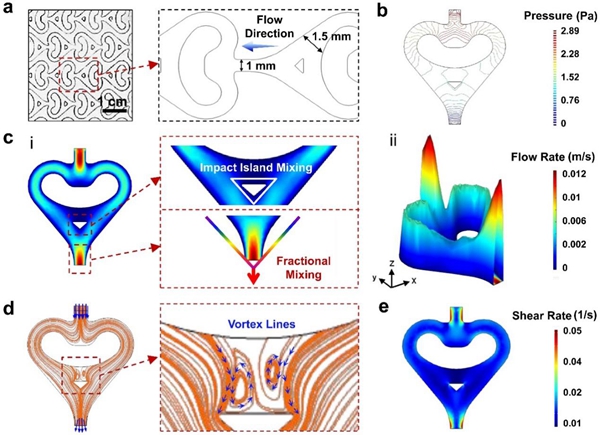 與傳統(tǒng)的間歇式制備相比,微通道反應(yīng)器具有體積小、比表面積大、層流、反應(yīng)條件溫和等特性,進(jìn)而帶來傳質(zhì)傳熱速率快、停留時(shí)間短、溫度和停留時(shí)間分布窄、產(chǎn)物粒度分布窄等優(yōu)點(diǎn),并且反應(yīng)過程安全可控。在心形微通道反應(yīng)器中對粉末懸浮液的流經(jīng)過程進(jìn)行Comsol 流速、壓力和剪切速率分布模擬,發(fā)現(xiàn)特制心形結(jié)構(gòu)可帶來分合混合、沖擊島混合和可變流速沖擊混合,這些混合和局部剪切作用可以促進(jìn)非均相的快速有效混合,使得芳綸納米纖維分散液的制備過程更加高效和均勻(圖3)。