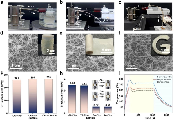 繼續(xù)遵循微流控制備策略,采用微流控濕法紡絲、微流控濕法成膜、微流控3D打印等微流控加工技術(shù)聯(lián)合冷凍干燥技術(shù)制備了氣凝膠纖維、氣凝膠薄膜和可編程氣凝膠制品。通過連續(xù)微流控技術(shù),這種經(jīng)過級聯(lián)微流控過程制備的膠體氣凝膠實(shí)現(xiàn)了分散液的直接利用,無需預(yù)收集即可從原料直接得到纖維、薄膜和3D打印制品,可大幅降低生產(chǎn)成本,此外,將級聯(lián)微流控處理的膠體氣凝膠與傳統(tǒng)方法制備的氣凝膠相比,兩者具有相似的成形性、微觀結(jié)構(gòu)和性能,表明微流控去質(zhì)子化與傳統(tǒng)間歇式制備方法具有相同的剝離效果,顯示了M-ANFs的多用途(圖5)。