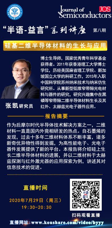 中科院蘇州納米所張凱研究員作為第八期的嘉賓,線上直播主講了“硅基二維半導(dǎo)體材料的生長(zhǎng)與應(yīng)用”的主題報(bào)告。報(bào)告介紹了硅上生長(zhǎng)二維半導(dǎo)體材料的進(jìn)展,并以二維材料于太赫茲探測(cè)與紅外激光器的應(yīng)用探索為例,講述其對(duì)信息技術(shù)的促進(jìn)。