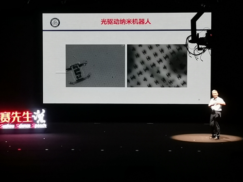 針對納米生物醫(yī)學的發(fā)展,王強斌簡單介紹了團隊曾獲得江蘇省科學技術一等獎的近紅外二區(qū)熒光醫(yī)學成像技術在疾病診斷、治療方面的創(chuàng)新突破和廣泛應用;介紹了納米機器人在生命健康方面的最新進展和應用前景。原位、實時的小動物活體醫(yī)學影像、DNA納米機器人治療腫瘤、光驅動納米機器人……,激發(fā)了廣大聽眾的無限好奇和極大興趣。
