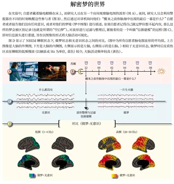 由于這些不確定性,夢(mèng)在科學(xué)世界被視作是一個(gè)模糊、有爭(zhēng)議、難以甚至無法探究的話題。的確,探索夢(mèng)的本質(zhì)時(shí)會(huì)遇到種種阻礙,因?yàn)閴?mèng)轉(zhuǎn)瞬即逝,很快就會(huì)被人們遺忘,而且夢(mèng)境的內(nèi)容總是出人意料,難以用語言描述。由于以上原因,研究人員需要在夜晚喚醒自愿者,以便收集與夢(mèng)有關(guān)的證據(jù),但這對(duì)于自愿者和研究人員雙方來說都不是什么愉快的經(jīng)歷。此外,還有技術(shù)層面的困難需要攻克。為了正確描述與夢(mèng)有關(guān)的大腦活動(dòng)特征,需要毫秒級(jí)的時(shí)間分辨率和精確的空間分辨率,來識(shí)別大腦不同區(qū)域的電活動(dòng)。幸運(yùn)的是,近年來取得的一些技術(shù)進(jìn)步提高了我們研究睡眠的可能性。