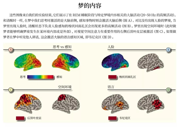 除此之外,我們還觀察到,在REM睡眠階段,某些夢(mèng)的內(nèi)容與大腦特定區(qū)域的激活緊密相關(guān)。與之相似的是,如果大腦在清醒階段感知相同的內(nèi)容,這些區(qū)域也會(huì)被激活。舉個(gè)例子,當(dāng)自愿者夢(mèng)到人臉的時(shí)候,梭狀回面孔區(qū)會(huì)被激活,而在清醒狀態(tài)下感知人臉時(shí)也是如此。盡管這一切看起來似乎理所當(dāng)然,但卻是科學(xué)界邁出的重要一步:它表明夢(mèng)境反映了睡眠中產(chǎn)生的種種經(jīng)歷,因此夢(mèng)并不像許多學(xué)者所認(rèn)為的那樣,只是蘇醒時(shí)產(chǎn)生的虛假記憶。