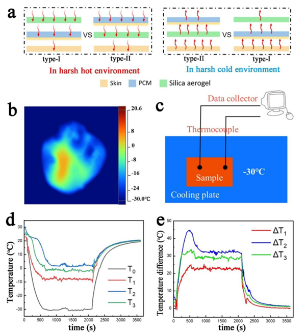 目前有很多研究選擇將相變材料封裝在氣凝膠中,解決相變材料的泄漏和低負(fù)載率問題,然而這種相互兼并的策略使得氣凝膠失去其獨特的結(jié)構(gòu)和低熱導(dǎo)率。因此本工作設(shè)計了如圖2a所示的兩種LBL結(jié)構(gòu),將具有低熱導(dǎo)率的氧化硅氣凝膠與具有高相變焓的相變微膠囊結(jié)合,得到一種在極寒(-30℃)和炎熱(70℃)條件下的熱管理結(jié)構(gòu)。如圖2所示,采用氣凝膠作為保溫層時,溫度在94 s時開始低于20 ℃。Ⅰ型和Ⅱ型LBL的溫度開始降到20℃以下的時間分別為450s和252s。與氣凝膠層相比,Ⅰ型LBL結(jié)構(gòu)延遲了4.8倍,且達(dá)到熱平衡時,LBL的溫度比氣凝膠的溫度高達(dá)10℃以上,而最高溫差達(dá)到25℃以上。