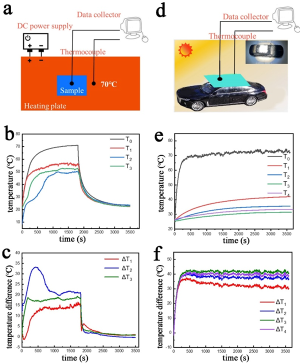 夏季在太陽光的照射下,沒有任何遮擋的車輛車內(nèi)溫度很容易達(dá)到高溫。因此本工作先后研究了這兩種結(jié)構(gòu)直接加熱以及在太陽光模擬器照射下車輛模型的隔熱效果(圖3)。研究發(fā)現(xiàn),在70℃的高溫環(huán)境下,Ⅰ型的LBL結(jié)構(gòu)保持舒適溫度(<31℃)的能力是Ⅱ型結(jié)構(gòu)和單一氣凝膠層的2.6倍和13.6倍。在太陽光模擬器下的結(jié)果表明,當(dāng)車輛外部溫度達(dá)到70℃時,Ⅰ型LBL結(jié)構(gòu)的最高溫差為42℃,是無任何保溫結(jié)構(gòu)的1.4倍,且長時間維持車內(nèi)溫度低于28℃,使車內(nèi)環(huán)境中更加舒適。
