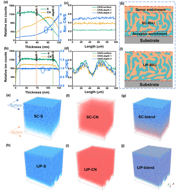近期,駱群副研究員等就噴墨印刷有機光伏活性層相分離形貌調(diào)節(jié)開展系統(tǒng)研究。首先,通過印刷點間距和基底溫度調(diào)節(jié)墨滴的干燥和融合,獲得表觀質(zhì)量高的薄膜。其中,提升印刷時基底溫度有效抑制了薄膜中有機分子的過度聚集,提升了激子解離效率和器件光電轉(zhuǎn)換效率,但是噴墨印刷的器件效率低于常規(guī)旋涂方法的電池。薄膜的微觀形貌特征表明,基于熱基底上噴墨印刷獲得的薄膜垂直方向呈現(xiàn)出給體和受體材料均勻分布的特點,而旋涂制備的薄膜給體和受體分別在陽極和陰極界面有富集。這樣一種給受體在界面處富集的垂直相分離形貌有利于電荷在陰陽界面處的選擇性收集,提升電池載流子收集效率。所以在抑制分子過度聚集的同時,調(diào)控薄膜的垂直相分離是形貌優(yōu)化和進一步提升電池效率的關(guān)鍵。