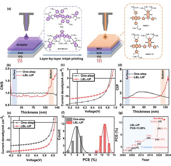 圖2. 順序噴墨印刷實現(xiàn)gradient狀的垂直相分離形貌,獲得基于噴墨印刷活性層的有機太陽電池效率超過13%