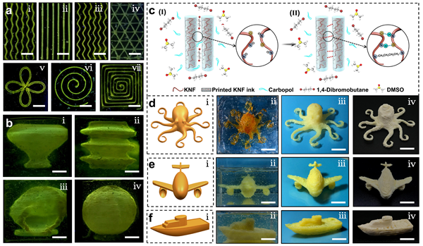 在MSP策略實(shí)施過(guò)程中,沉積在微凝膠基質(zhì)中的KNF墨水立即進(jìn)行部分溶膠-凝膠轉(zhuǎn)變,基質(zhì)可臨時(shí)支撐未完全凝膠化的KNF線條直至其完全凝膠老化。利用二甲基亞砜(DMSO)和卡波姆(Carbopol)的分散-質(zhì)子化凝膠作用,以及1,4-二溴丁烷(Db)的化學(xué)交聯(lián)作用,Db可在KNF的氮負(fù)離子位點(diǎn)進(jìn)行取代反應(yīng),從而在相鄰KNF線條間形成共價(jià)烷烴鍵,促進(jìn)相鄰KNF打印線條之間的粘附力,進(jìn)而保證結(jié)構(gòu)的完整性。此外,在針頭直徑一定的情況下,墨水的擠出速率(νe)、針頭的移動(dòng)速率(打印速度,νp)、基質(zhì)中KNF(ν1)和Db(ν2)的雙擴(kuò)散速率共同影響著KNF打印線條的形態(tài)和直徑。由于MSP策略中微凝膠基質(zhì)的輔助作用,擠出打印方法對(duì)墨水的流變性要求不嚴(yán)格,因此打印速度大大提高(高達(dá)167 mm s-1),遠(yuǎn)高于文獻(xiàn)報(bào)道的打印速度(通常小于20 mm s-1),提高了制備效率。