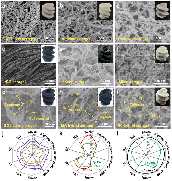 通過(guò)使用相應(yīng)的前驅(qū)體墨水,上述MSP策略可以推廣到其他氣凝膠的構(gòu)筑,包括有機(jī)(纖維素、海藻酸鹽、殼聚糖)、無(wú)機(jī)(石墨烯、MXene、二氧化硅)和無(wú)機(jī)-有機(jī)(石墨烯/纖維素、MXene/海藻酸鹽、二氧化硅/殼聚糖)復(fù)合氣凝膠。所有3D打印的氣凝膠都顯示出良好的螺旋形狀,內(nèi)部具有豐富的多孔結(jié)構(gòu),驗(yàn)證了MSP策略的普適性。該方法打破了傳統(tǒng)基于擠出的直寫(xiě)成型技術(shù)對(duì)墨水流變性能的嚴(yán)格要求,大大拓展了可打印材料的種類(lèi)。