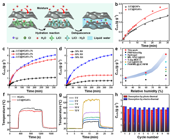 通過對石墨烯片層進行刻蝕處理可以顯著增強吸濕纖維的動力學(圖3),在30 min吸濕性石墨烯氣凝膠纖維LiCl@GAFs與LiCl@HGAFs吸濕量分別為1.37g g-1和1.81g g-1,提升了32.1%。并且LiCl@HGAFs在較寬濕度范圍內具有高吸濕量,在相對濕度為90%條件下6小時的吸濕量可達4.14 g g-1而不產生泄露,即使在相對濕度為30%的條件下吸濕量依然可達0.66g g-1,這是由于LiCl超強的吸濕性以及HGAFs優(yōu)異的限域能力。此外,LiCl@HGAFs具有良好的光響應性與電響應性。在一個太陽照射下,纖維溫度可在44s內從22℃升至46℃,在光熱條件下纖維脫附再生程度可以達到83.4%。在12V電壓下纖維表面溫度可達131℃,這個條件下可以使吸濕后的纖維完全再生。進一步的循環(huán)測試表明,在10次吸附-脫附循環(huán)中,LiCl@HGAFs的吸附量沒有明顯退化,表明其具備良好的穩(wěn)定性。
