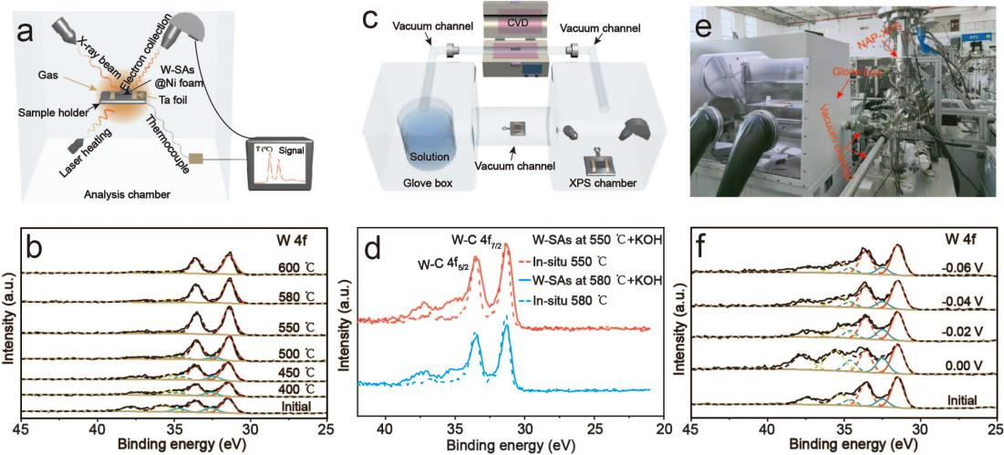圖1. Nano-X能源催化方向原位/準原位表征設(shè)備:(a)原位變溫NAP-XPS測試示意圖,(b)變溫測試W 4f XPS精細譜,(c)CVD管式爐-手套箱-NAP-XPS三角互聯(lián)裝置圖,(d)CVD/手套箱處理樣品后,不暴空氣轉(zhuǎn)移至NAP-XPS記錄的W 4f XPS精細譜,(e)手套箱-NAP-XPS實物圖,(f)手套箱中電化學(xué)工作站處理樣品后,準原位轉(zhuǎn)移至NAP-XPS分析腔測試W 4f XPS精細譜。