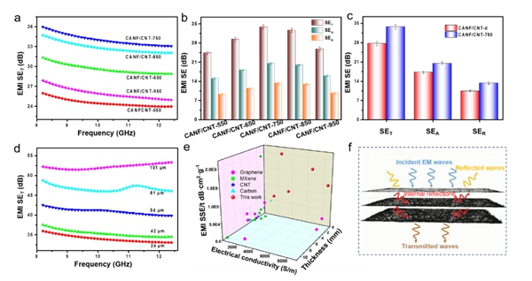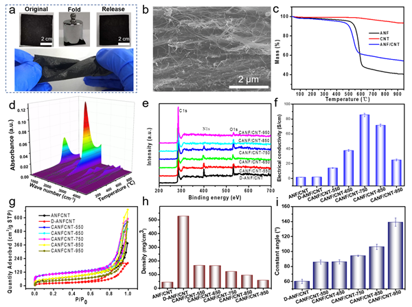 隨后,如圖3所示,研究了碳化溫度對氣凝膠薄膜力學(xué)、比表面積、孔徑結(jié)構(gòu)、電導(dǎo)率、密度以及親疏水性能的影響。通過ANF和CNT的雙軸取向重構(gòu)后,氣凝膠薄膜的力學(xué)性能得到了明顯增強(qiáng)。隨著碳化溫度的增加,薄膜的電導(dǎo)率逐漸增強(qiáng)。當(dāng)碳化溫度為750℃時(shí),薄膜的電導(dǎo)率可以達(dá)到8540S m-1;而進(jìn)一步提高碳化溫度后,薄膜的電導(dǎo)率逐漸降低。這是由于ANF在熱分解碳化過程中產(chǎn)生小分子的氣體會誘導(dǎo)薄膜的孔隙再生行為。由于CNT和ANF分別具有疏水性和親水性,隨著ANF的熱分解,氣凝膠薄膜的疏水角逐漸增加,表現(xiàn)出一定的疏水性能。