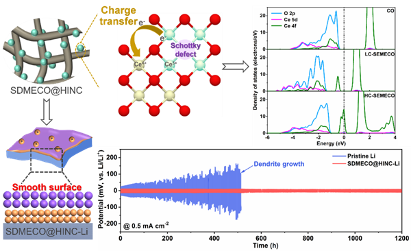 針對(duì)不可控鋰離子/原子動(dòng)力學(xué)行為引起的枝晶生長(zhǎng)的問(wèn)題,中科院蘇州納米所藺洪振研究員聯(lián)合西安理工大學(xué)游才印團(tuán)隊(duì)張靜博士與德國(guó)亥姆赫茲電化學(xué)研究所王健博士,從表界面功能化角度出發(fā),首次提出利用高活性電催化劑去調(diào)劑鋰離子動(dòng)力學(xué)行為,具體而言,采用肖脫基缺陷調(diào)控氧化鈰的4f中心電子結(jié)構(gòu)(SDMECO@HINC),產(chǎn)生大量活性位點(diǎn)提升其催化活性。SDMECO@HINC在Li去溶劑化和Li擴(kuò)散動(dòng)力學(xué)方面表現(xiàn)出了優(yōu)異的電催化活性,平滑鋰鍍層實(shí)現(xiàn)了無(wú)枝晶長(zhǎng)壽命的鋰金屬電池。