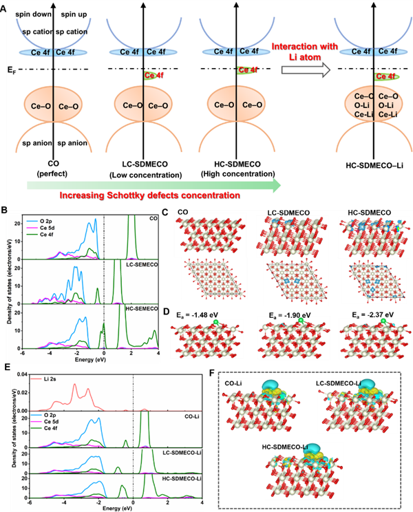 圖2 理論模擬肖脫基缺陷調(diào)控氧化鈰電子結(jié)構(gòu)及其與鋰原子的作用關(guān)系