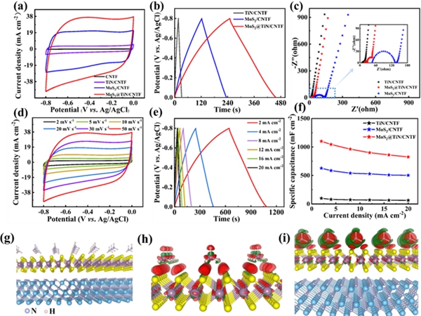 其次,對銨根離子的存儲行為進行了電化學(xué)研究(圖2)。相對于單一結(jié)構(gòu)和組分的TiN/CNTF、MoS2/CNTF電極材料,MoS2@TiN/CNTF展現(xiàn)出優(yōu)異的贗電容特性和高的容量(1044.3 mF cm-2, 4 mA cm-2),這歸功于MoS2@TiN復(fù)合材料其本身的三維分級結(jié)構(gòu)的協(xié)同效應(yīng)。另外,理論計算證明,高導(dǎo)電性TiN不僅改善了MoS2對NH4+的結(jié)合能力,而且由于NH4+的存在導(dǎo)致了MoS2@TiN異質(zhì)結(jié)構(gòu)界面處的電荷重新分布而形成內(nèi)建電場,進一步提高了與NH4+結(jié)合強度。