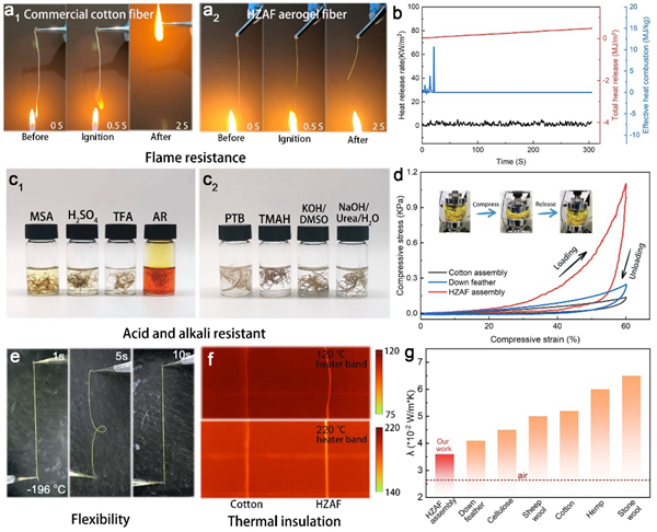 圖3. HZAF極端環(huán)境下的應(yīng)用。a1, a2)商品棉纖維與HZAFs的點(diǎn)火比較。b)HZAF的放熱率、總放熱量和有效熱燃燒值。c1, c2)纖維對(duì)酸或堿的化學(xué)穩(wěn)定性。d) HZAFs、羽絨和棉集合體的壓縮應(yīng)力-應(yīng)變曲線。e) HZAF在液氮中的柔韌性。f)單根HZAF和棉纖維分別在120 和220 熱臺(tái)上的紅外圖像。g) HZAFs集合體與當(dāng)前商用絕熱材料的導(dǎo)熱系數(shù)比較