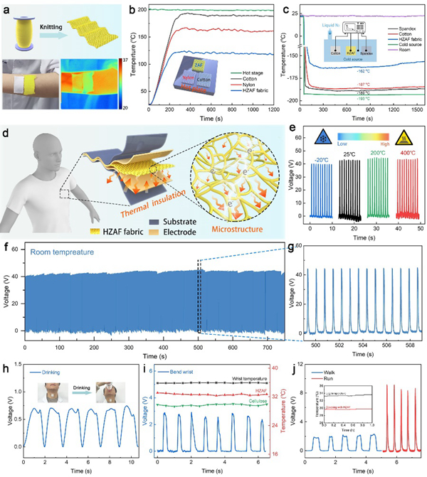 進(jìn)一步將HZAF編織成織物,織物延續(xù)了HZAF的優(yōu)異的保溫隔熱能力和耐極端溫度特性。此外將織物用于TENG中的高性能負(fù)摩擦材料,所制備的TENG在寬的溫度范圍內(nèi)顯示出穩(wěn)定的輸出性能,可檢測人體的各種運(yùn)動(dòng)并起到保暖作用。