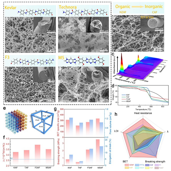 圖5. 通過CPAGS策略構(gòu)建不同類型的高性能氣凝膠纖維。a1)凱夫拉氣凝膠纖維。a2) Technora氣凝膠纖維。a3) F3氣凝膠纖維。a4) M5氣凝膠纖維。b) HZAFs衍生的碳?xì)饽z纖維。c) HZAFs的TG-FTIR圖譜。d) 各氣凝膠纖維的TG曲線。e) COMSOL中的網(wǎng)格模型和模擬單元。f)氣凝膠纖維的導(dǎo)熱系數(shù)計(jì)算值。g)氣凝膠纖維的SSA和斷裂強(qiáng)度。h) HZAF與其他氣凝膠纖維的綜合性能比較