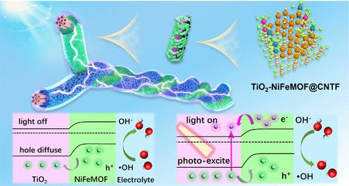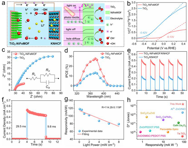 為提升光電化學纖維光電探測器在自供電條件下響應度和響應時間,研究者通過負載2D Ni?Fe金屬-有機骨架(NiFeMOF)納米片原位修飾n型一維(1D)TiO2納米線陣列用作分級異質(zhì)結(jié)光陽極、鎳普魯士藍(KNHCF)納米立方體作為儲能電極,以CMC/Li2SO4作為凝膠電解質(zhì),組裝了光電化學纖維狀光電探測器。與之前工作相比,該項目不同之處在于異質(zhì)結(jié)構(gòu)設(shè)計使得器件具有優(yōu)異自供電特性,以避免水下應用時額外的能源供應問題。TiO2-NiFeMOF異質(zhì)分層結(jié)構(gòu)的合理設(shè)計有助于在互連界面上實現(xiàn)高效的載流子耦合和快速的電荷轉(zhuǎn)移,從而有效地增強光生電子-空穴對的分離和轉(zhuǎn)移。由此產(chǎn)生的柔性自供電光電探測在零偏壓的條件下實現(xiàn)了88.6 mA/W的高響應度和<30 ms的響應時間,滿足了水下應用需求。所制備的器件還可以編織商用織物中構(gòu)筑光電紡織品,在陸地和水下環(huán)境中工作,為檢測陸地上的紫外線強度和促進水下光通信提供了一種多功能工具。