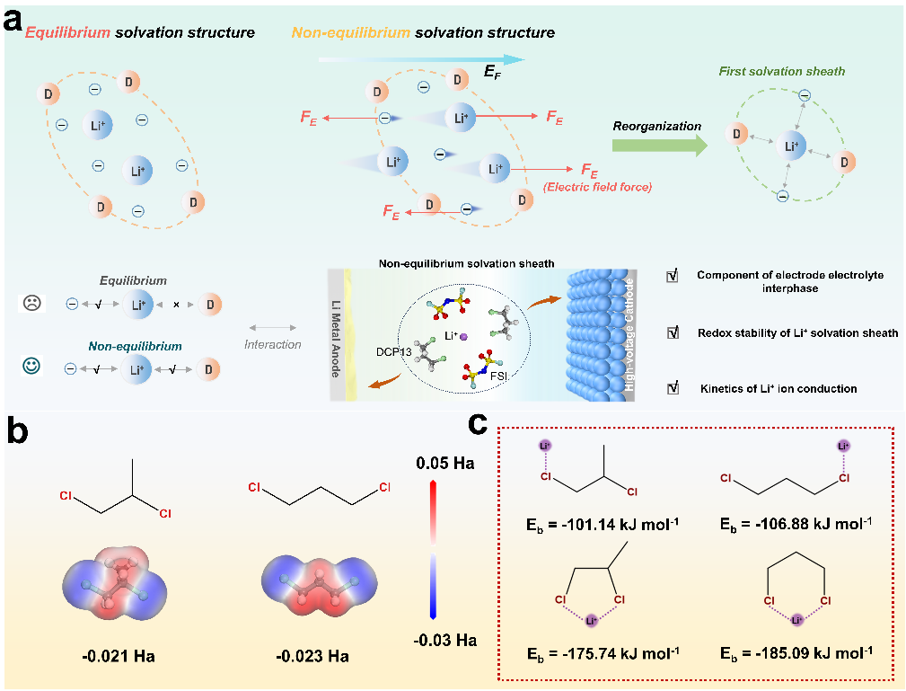 圖1.?(a) 在外部電場(chǎng)作用下,從平衡態(tài)溶劑化結(jié)構(gòu)到非平衡態(tài)溶劑化結(jié)構(gòu)的轉(zhuǎn)變示意圖。(b) DCP12和DCP13的分子結(jié)構(gòu)和靜電勢(shì)圖。(c) 不同構(gòu)型的Li+離子與DCP12和DCP13的結(jié)合能強(qiáng)弱