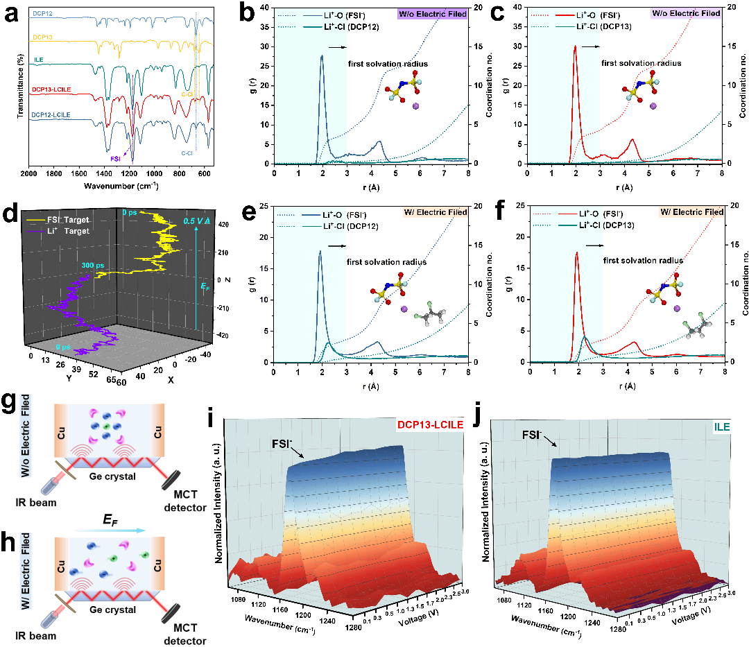 圖2.?在靜態(tài)條件和外部電場(chǎng)下平衡和非平衡態(tài)溶劑化結(jié)構(gòu)表征。(a) 不同電解質(zhì)體系的非原位FTIR圖譜。(b) 在靜態(tài)條件下DCP12-LCILE的徑向分布函數(shù)(RDF)和配位數(shù)(CN)。(c) 在靜態(tài)條件下DCP13-LCILE的徑向分布函數(shù)(RDF)和配位數(shù)(CN)。(d) 在0.5 V ?-1的外部電場(chǎng)中Li+離子和FSI-陰離子的運(yùn)動(dòng)軌跡。(e) 在外部電場(chǎng)下DCP12-LCILE的徑向分布函數(shù)(RDF)和配位數(shù)(CN)。(f) 在外部電場(chǎng)下DCP13-LCILE的徑向分布函數(shù)(RDF)和配位數(shù)(CN)。(g,h) 用ATR-IR原位監(jiān)測(cè)無(wú)或有外部電場(chǎng)的DCP13-LCILE溶劑化結(jié)構(gòu)示意圖。(i,j) 不同電勢(shì)下DCP13-LCILE和(j) ILE的原位FTIR圖譜