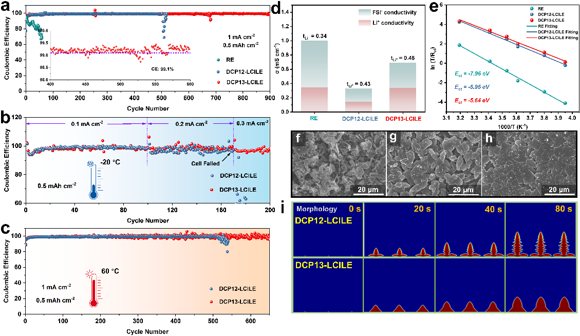 圖3.?RE、DCP12-LCILE和DCP13-LCILE中鋰沉積/剝離的電化學(xué)性能。(a) 使用RE、DCP12-LCILE和DCP13-LCILE的Li/Cu電池在1 mA cm-2和0.5 mAh cm-2下的室溫庫(kù)倫效率。(b,c) 使用DCP12-LCILE和DCP13-LCILE的Li/Cu電池在(b) -20℃和(c) 60℃的庫(kù)倫效率。(d) 離子電導(dǎo)率和Li+遷移數(shù)。(e) 阿倫尼烏斯曲線。使用(f) RE、(g) DCP12-LCILE和(h) DCP13-LCILE在Cu箔上鍍Li的SEM形貌。(i) DCP12-LCILE和DCP13-LCILE中鋰枝晶生長(zhǎng)的有限元模擬