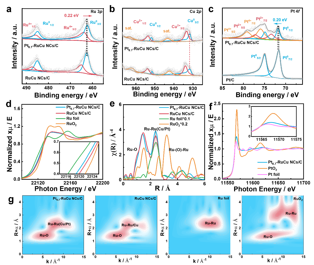 基于此,中國科學(xué)院蘇州納米技術(shù)與納米仿生研究所徐勇研究員團(tuán)隊(duì)、廈門大學(xué)黃小青團(tuán)隊(duì)、常熟理工學(xué)院耿洪波教授合作報(bào)道了在RuCu上外延Pt的三元中空納米籠(Pt-RuCu NCs)作為高效的HOR催化劑,并將其應(yīng)用于AEMFCs。結(jié)合X射線光電子能譜(XPS)、X射線吸收能譜(XAS)、原位傅立葉變換紅外光譜(FTIR)和密度泛函理論(DFT)計(jì)算表明,優(yōu)化后的Pt8.7-RuCu NCs/C上的電子從Pt轉(zhuǎn)移到Ru,改變了電子性質(zhì)并調(diào)節(jié)了H*和OH*的吸附特性,從而顯著提高了HOR性能。