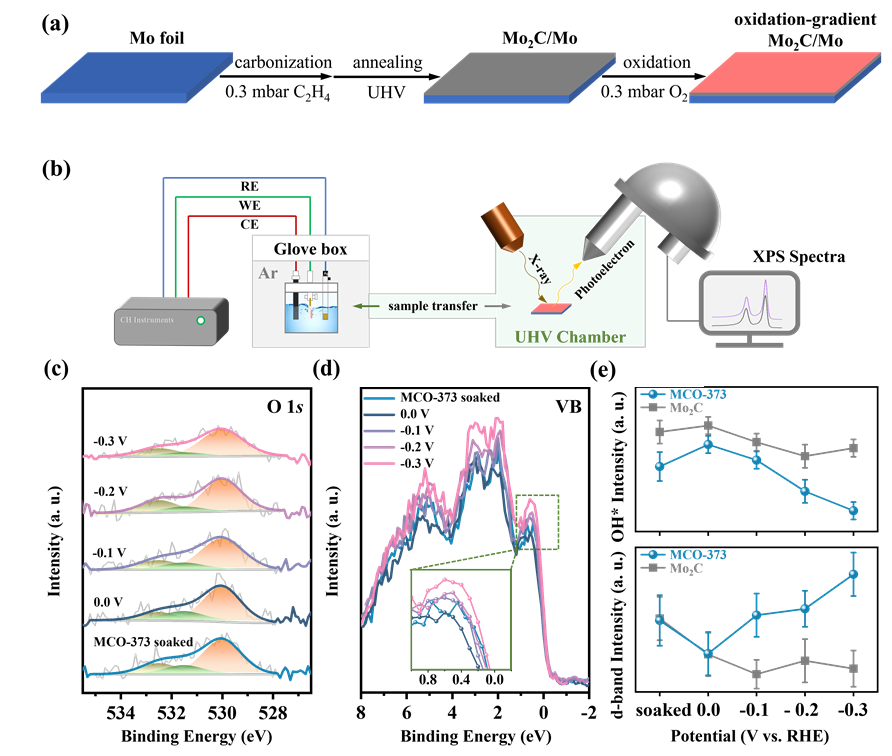 圖1.氧修飾Mo2C模型電催化劑的制備和模型電催化劑的堿性HER反應(yīng)準(zhǔn)原位XPS表征