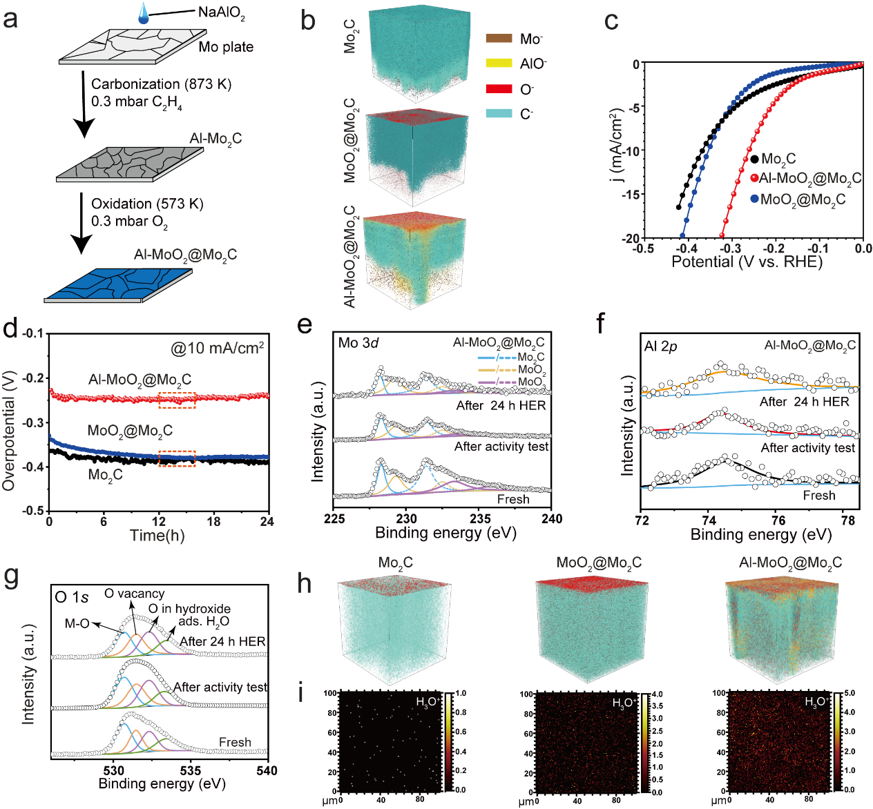 圖2. Al-MoO2@Mo2C模型催化劑的可控制備、電化學(xué)性能測(cè)試和譜學(xué)表征