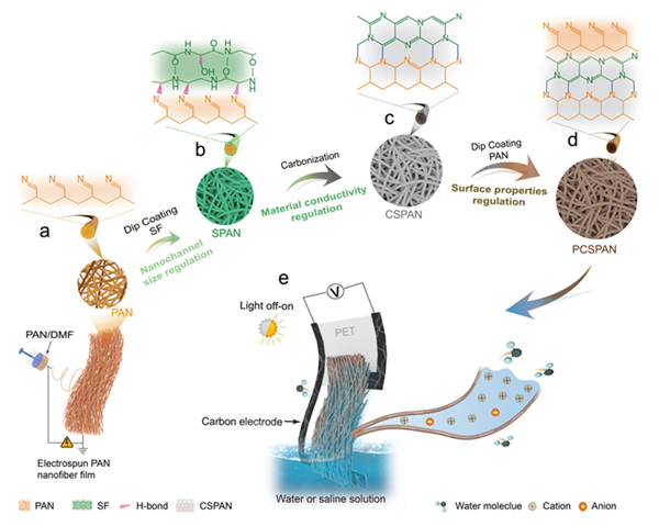 圖2.??ENFs中納米通道的構(gòu)建與尺寸調(diào)節(jié)。a-b)ENFs的孔徑分布。c)PCPAN和PCSPAN ENFs的形態(tài)和截面。d)不同時(shí)間下,PCPAN和PCSPAN ENFs表面水接觸角變化的光學(xué)圖像。e)垂直放置的PCPAN和PCSPAN ENFs中水的爬升速率曲線。f)ENFs器在去離子水中的開路電壓值。g)基于不同納米通道尺寸的PCSPAN ENFs(左、中)和低官能團(tuán)含量的CSPAN ENFs(右)的水伏器件在去離子水中的工作機(jī)理示意圖