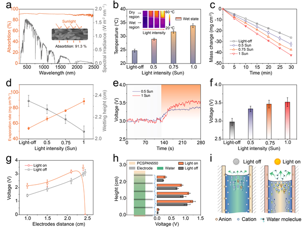 圖4.不同光照強(qiáng)度下PCSPAN550 ENFs納米通道水分蒸發(fā)速率的調(diào)控。a)PCSPAN550 ENFs的紫外吸收光譜圖。b)PCSPAN550 ENFs濕態(tài)區(qū)域的表面溫度統(tǒng)計(jì)圖。c)不同光照強(qiáng)度下PCSPAN550 ENFs器件中水的變化量。d)PCSPAN550 ENFs器件中水的蒸發(fā)速率和水的潤(rùn)濕高度。e)光熱轉(zhuǎn)換下PCSPAN ENFs器件的實(shí)時(shí)V-t曲線。f)PCSPAN550 ENFs器件的開路電壓。g)不同電極距離下PCSPAN550 ENFs器件在1 Sun下開路電壓。h)1Sun下PCSPAN550 ENFs器件兩電極間開路電壓的差異。i)光熱轉(zhuǎn)換水伏器件在去離子水中的工作機(jī)理示意圖