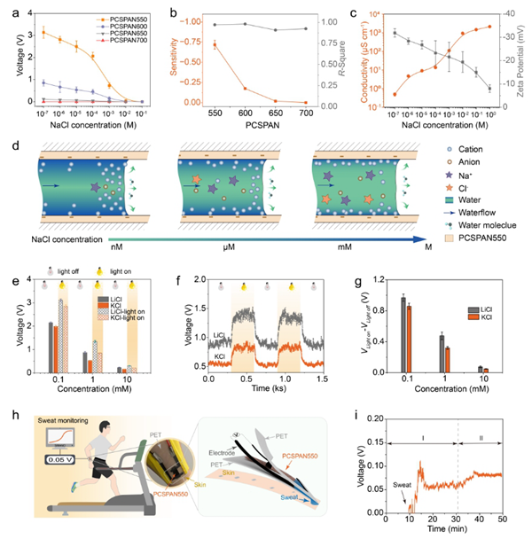 圖5. PCSPAN水伏電壓信號(hào)和離子濃度與電解質(zhì)監(jiān)測(cè)性能的關(guān)系。a)不同導(dǎo)電性下PCSPAN器件對(duì)NaCl溶液的開路電壓響應(yīng)。b)圖a中離子濃度-電壓曲線線性區(qū)域的靈敏度S和R2值。c)不同NaCl濃度下離子電導(dǎo)率和PCSPAN550器件表面的zeta電位。d)ENFs器件輸出電壓對(duì)不同NaCl濃度的響應(yīng)示意圖。e)光熱和離子雙重作用下PCSPAN550器件的開路電壓。f)在KCl和NaCl濃度為1 μM時(shí),PCSPAN550器件在開燈和關(guān)燈循環(huán)光照(0.5 Sun)下的實(shí)時(shí)V-t曲線。g)開關(guān)光源時(shí)不同離子溶液濃度下PCSPAN550器件輸出電壓的變化。h)柔性PCSPAN550水伏離子傳感器件設(shè)計(jì)原理圖。i)PCSPAN550器件在不同出汗速率下的開路電壓變化