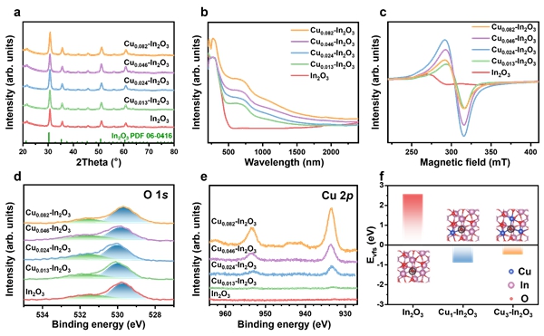 近日,中國科學院蘇州納米所李逸凡高級工程師與中國科學技術大學蘇州高等研究院熊宇杰教授、劉東教授合作在國際知名期刊Angwandte Chemie International Edition上發(fā)表題為Tailoring Oxygen Vacancies with Atomically Dispersed Cu Sites for Stable and Efficient Photothermal CO2?Conversion的研究性論文。該研究成功開發(fā)了一種具有原子級分散銅單原子的Cu-In2O3催化劑,在光熱CO2轉化中展現(xiàn)出卓越性能。銅單原子的引入誘導產生氧空位,顯著增強CO2吸附活化、光捕獲能力與光熱效應,同時促進H2解離。當銅負載量為2.4 wt%時,催化劑實現(xiàn)最優(yōu)單原子分散與最高氧空位濃度,在光熱逆水煤氣變換(RWGS)反應中表現(xiàn)出超越同類樣品的催化活性(CO選擇性>99%)、長效穩(wěn)定性(>450小時)與光熱能量轉化效率(46.17 mol·gCu-1·h-1)。相較于傳統(tǒng)熱催化,該體系在降低200 °C反應溫度條件下仍保持優(yōu)異性能。借助蘇州納米所納米真空互聯(lián)實驗站的原位(準原位)表征技術,該研究結果深化了對單原子催化劑與氧空位協(xié)同機制的理解,為高性能光熱催化劑設計提供了理論指導。該銅單原子修飾的In2O3催化劑作為新型光熱催化平臺,通過光能利用與局域熱管理優(yōu)化,為化學能高效轉化開辟了可持續(xù)路徑,為清潔能源技術發(fā)展提供了新思路。