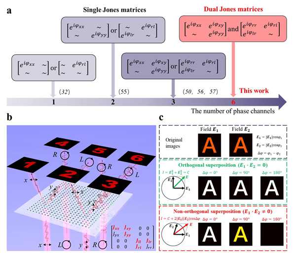 超表面是由周期性排列的亞波長結構單元組成的一種二維人工結構,它能夠實現(xiàn)對光波的多維靈活控制。通常,其光學響應可以通過 2×2 的瓊斯矩陣來表示,因此瓊斯矩陣相位通道數(shù)量對于提升超表面全息顯示能力和增強超表面的信息容量至關重要。然而,當光正入射超表面時,由于結構對稱性,在線性或圓極化基下,單個瓊斯矩陣最多只能實現(xiàn)三個獨立的相位通道。