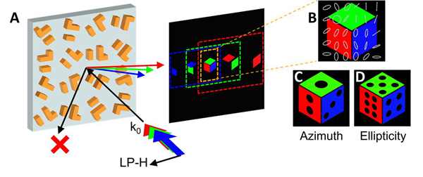 圖6. 基于雙奇異點的非對稱全彩矢量全息示意圖。(A)通過使用PB相位,具有相同圖案但不同大小的紅綠藍三色全息圖像在水平線偏光(LP-H)照明下以指定角度重疊,(B)從而在感興趣的區(qū)域產(chǎn)生任意(C)方位角和(D)橢偏率的非對稱全彩矢量全息圖。