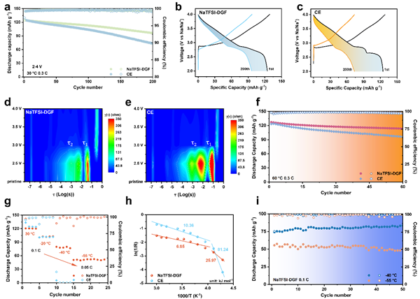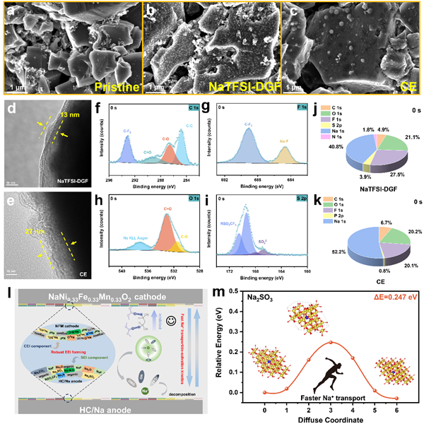 穩(wěn)定的電極-電解質(zhì)界面(EEI)能夠有效抑制電解液的持續(xù)分解,減少活性鈉的損失,從而提高了電池的循環(huán)穩(wěn)定性和庫侖效率。在長時間的循環(huán)過程中,這種穩(wěn)定的界面能夠保持良好的電化學(xué)性能,即使在極端溫度條件下也能保持較高的容量保持率。通過調(diào)控溶劑化結(jié)構(gòu),研究團隊發(fā)現(xiàn)在NaTFSI-DGF電解液體系中形成的EEI具有更高的穩(wěn)定性和離子導(dǎo)電性。在DMS和GN的協(xié)同作用下,EEI中富含無機成分(如NaF、Na?CO?、Na?SO?和Na?N),這些成分不僅提供了快速的Na?傳輸通道,還增強了界面的機械強度。