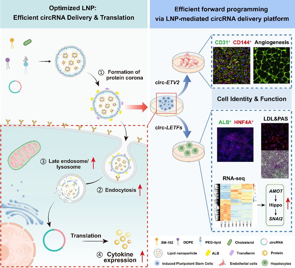 中國科學(xué)院蘇州納米技術(shù)與納米仿生研究所類器官中心的研究團(tuán)隊(duì)研究開發(fā)了一種高效的脂質(zhì)納米顆粒(LNP)遞送系統(tǒng)。成功利用LNP遞送編碼多種轉(zhuǎn)錄因子的環(huán)狀RNA(circRNA),實(shí)現(xiàn)對iPSCs的正向編程,將其高效分化為功能性的內(nèi)皮細(xì)胞和肝樣細(xì)胞,為類器官構(gòu)建提供了可靠的種子細(xì)胞來源(圖1)。