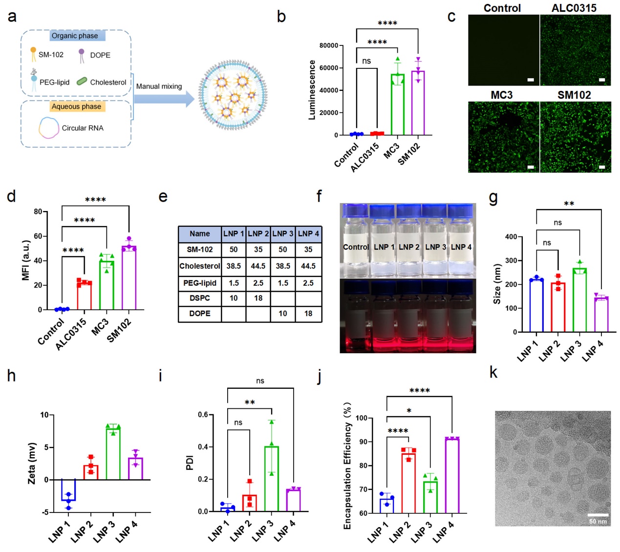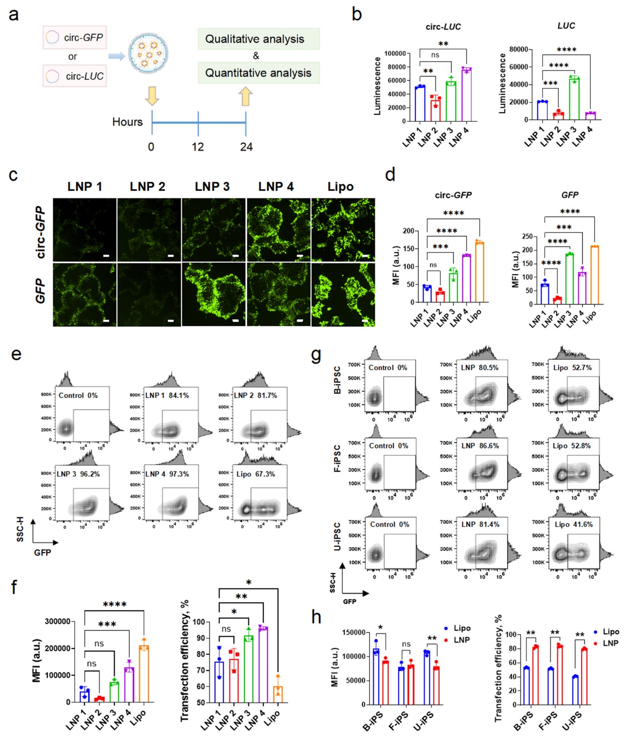 圖3 LNP4展現(xiàn)了高circRNA遞送效率及在iPSC上的高效報告基因表達(dá)